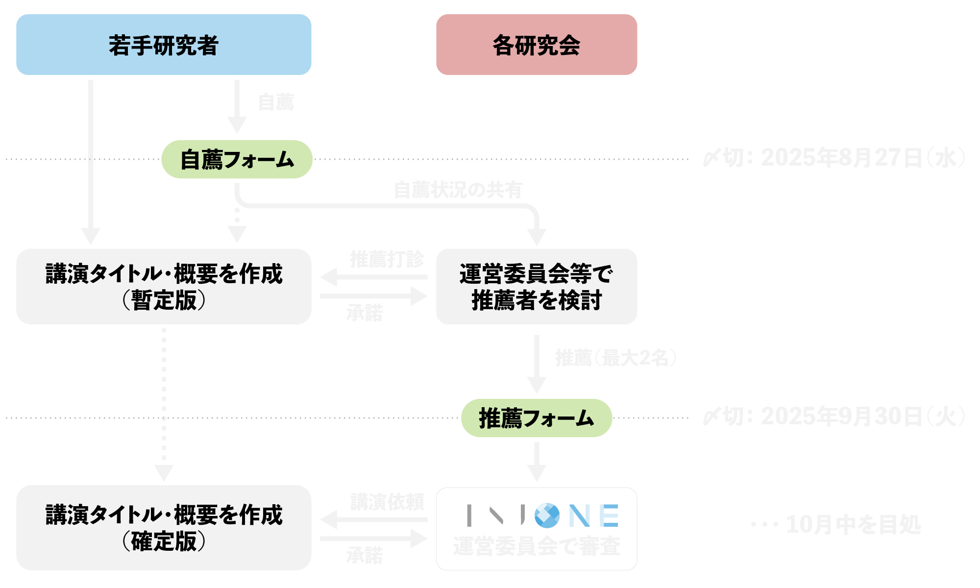 (2)研究会推薦フェーズ: IPSJ-ONE運営委員会より、自薦フォームへの応募結果を対応する研究会に共有します。 その後、各研究会の運営委員会や主査によって候補者を検討していただきます。 推薦対象者の内諾を得た上で、9/30(火)の2次締切までに研究会推薦フォームから応募をお願いいたします。